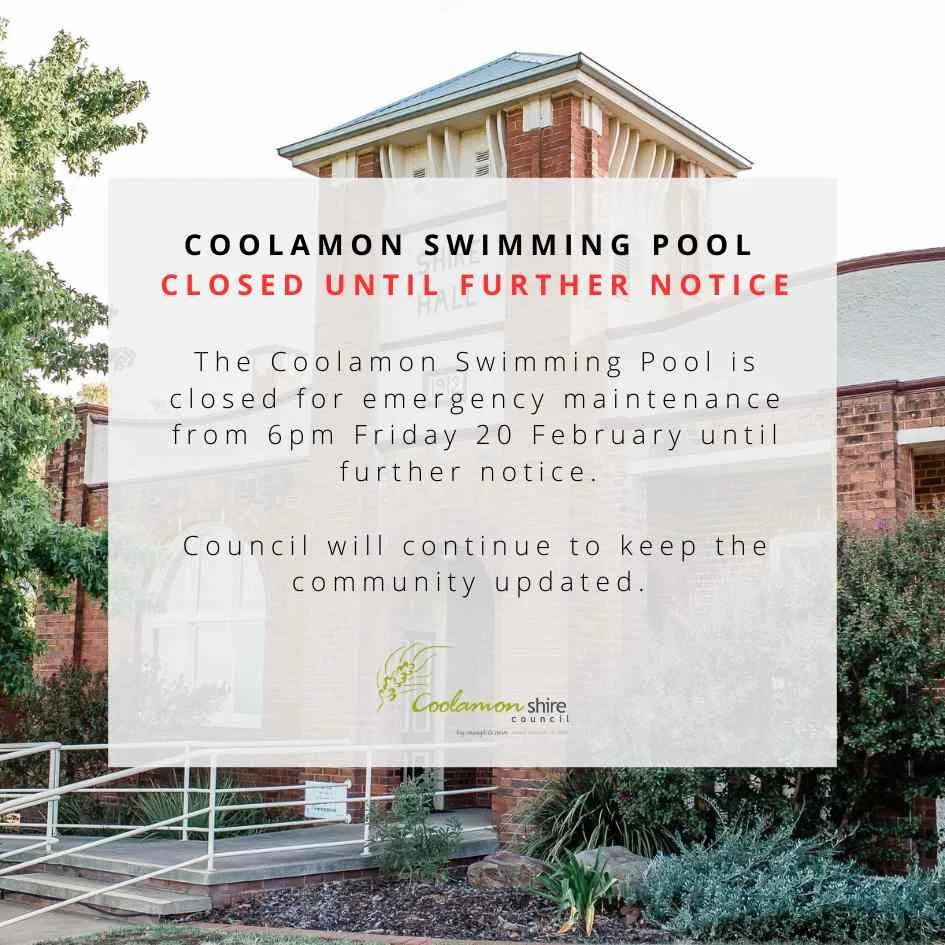 Coolamon Pool Closed Closed until Further Notice Laura Munro20 February 2026 Facebook0 Twitter 0 Likes
